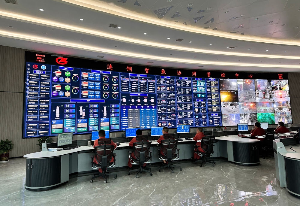 在漣鋼智能協(xié)同管控中心,LED屏幕上躍動著煉鋼環(huán)節(jié)的各項數(shù)據(jù)參數(shù)和生產(chǎn)一線的實時畫面,技術(shù)工人正在監(jiān)測分析生產(chǎn)動態(tài)信息。