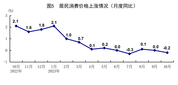 10月份,全國居民消費價格(CPI)同比下降0.2%,環(huán)比下降0.1%。分類別看,食品煙酒價格同比下降2.1%,衣著價格上漲1.1%,居住價格上漲0.3%,生活用品及服務(wù)價格下降0.6%,交通通信價格下降0.9%,教育文化娛樂價格上漲2.3%,醫(yī)療保健價格上漲1.3%,其他用品及服務(wù)價格上漲3.6%。在食品煙酒價格中,豬肉價格下降30.1%,鮮菜價格下降3.8%,糧食價格上漲0.6%,鮮果價格上漲2.2%??鄢称泛湍茉磧r格后的核心CPI同比上漲0.6%。1-10月份,全國居民消費價格同比上漲0.4%。